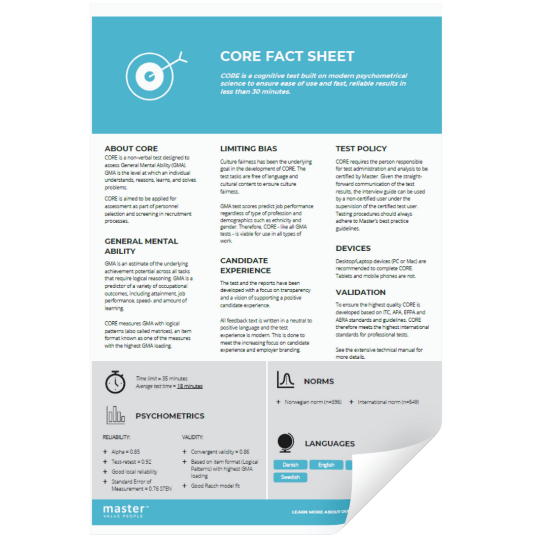 CORE er en moderne og effektiv kognitiv test, der hurtigt og præcist vurderer en kandidats generelle mentale evner (GMA). Testen er designet til at gøre det nemt for dig at identificere det rette match mellem kandidatens kognitive evner og jobkravene – på under 30 minutter.